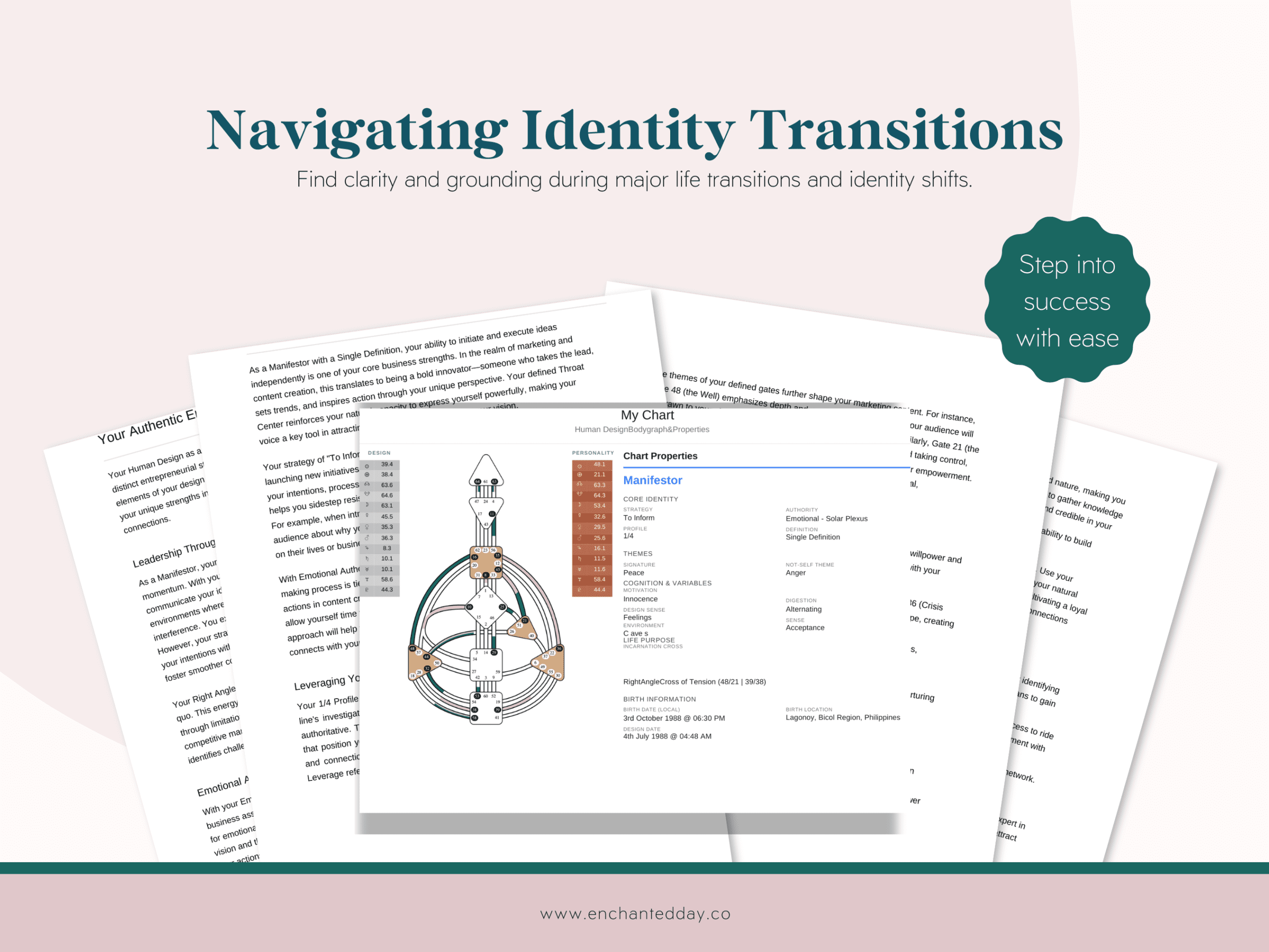 The Navigating Identity Transitions Report is a personalized guide to understanding and moving through life’s major shifts with the support of your unique Human Design. Whether you’re experiencing career changes, relationship shifts, parenthood, grief, or transformative life cycles, this report helps you align with your design to embrace your evolving identity.
